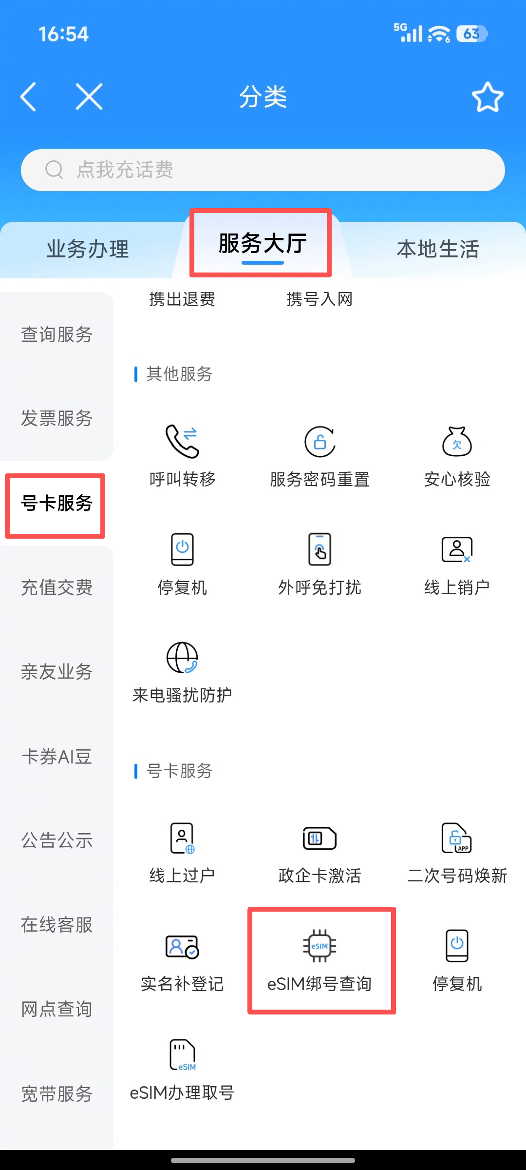 在中国移动App首页依次点击 服务大厅 → 号卡服务 → eSIM绑号查询。
