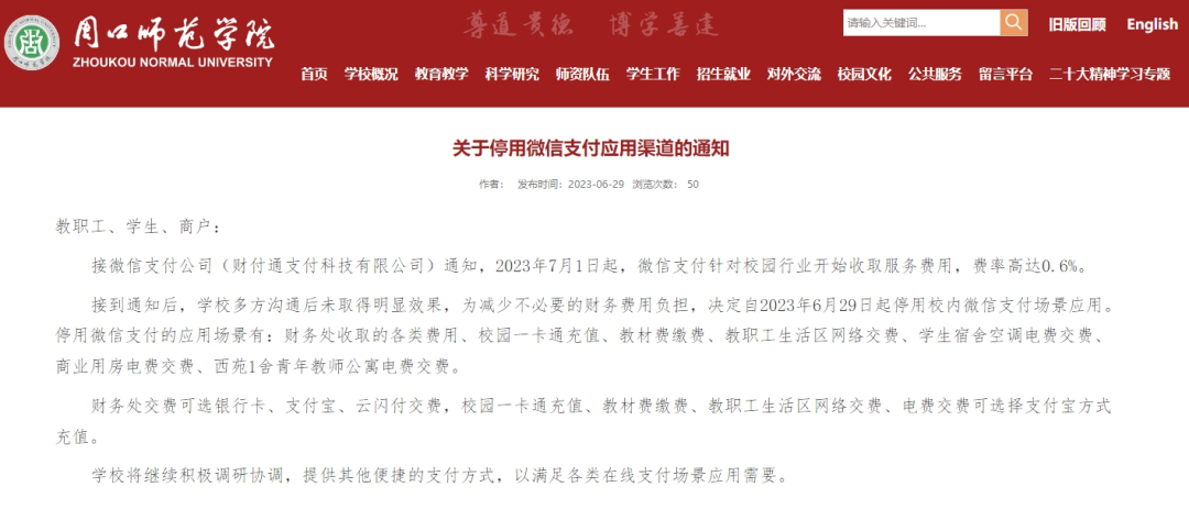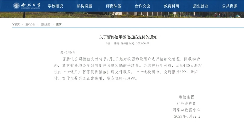 据悉,西北大学发布的公告称,“因腾讯公司微信支付将于7月1日起对校园场景用户进行精细化管理,除收学费外,其它收费均会受到限制并收取0.6%的手续费。为维护师生利益,从6月30日起对校内一卡通用户暂停提供微信扫码支付服务,一卡通校园卡、交通银行App、云闪付、支付宝等渠道正常使用,望各位师生周知。”