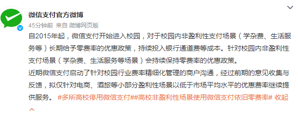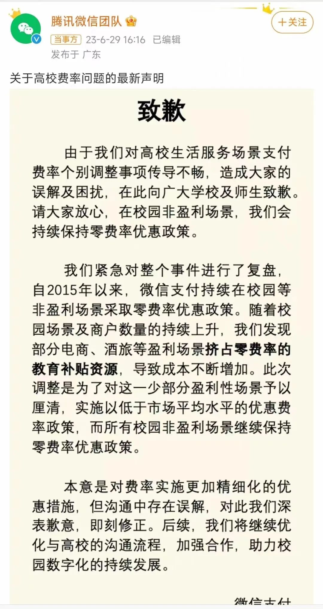 同时,腾讯微信团队官方微博今日也发布声明,表示由于对高校生活服务场景支付费率问题处理不周,造成大家的困扰,在此向广大学校及师生致歉。