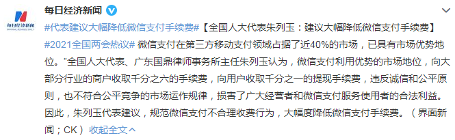 曾有人大代表建议大幅降低微信支付手续费。而关于微信支付手续费高不高的问题,大家看法不一。