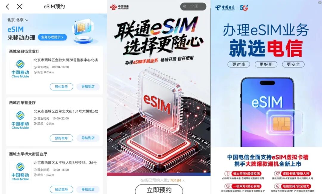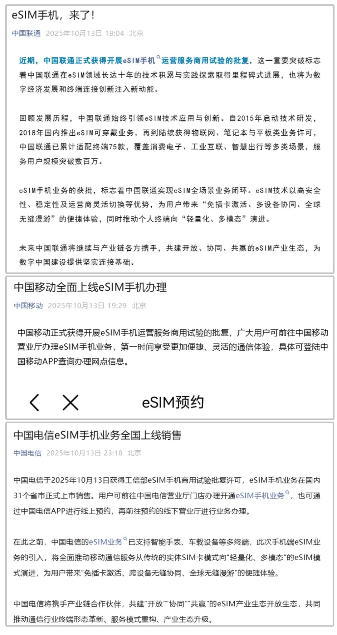 昨日晚,中国联通、中国移动、中国电信相继官宣,已获批启动 eSIM 手机商用试验,正式上线 eSIM 业务。