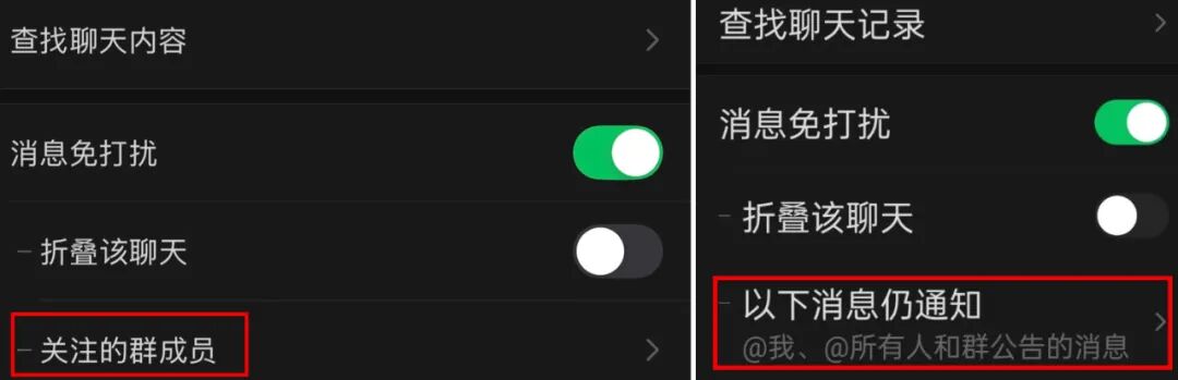 在开启“消息免打扰后”,可以看到,原本的“关注的群成员”改成了“以下消息仍通知”。