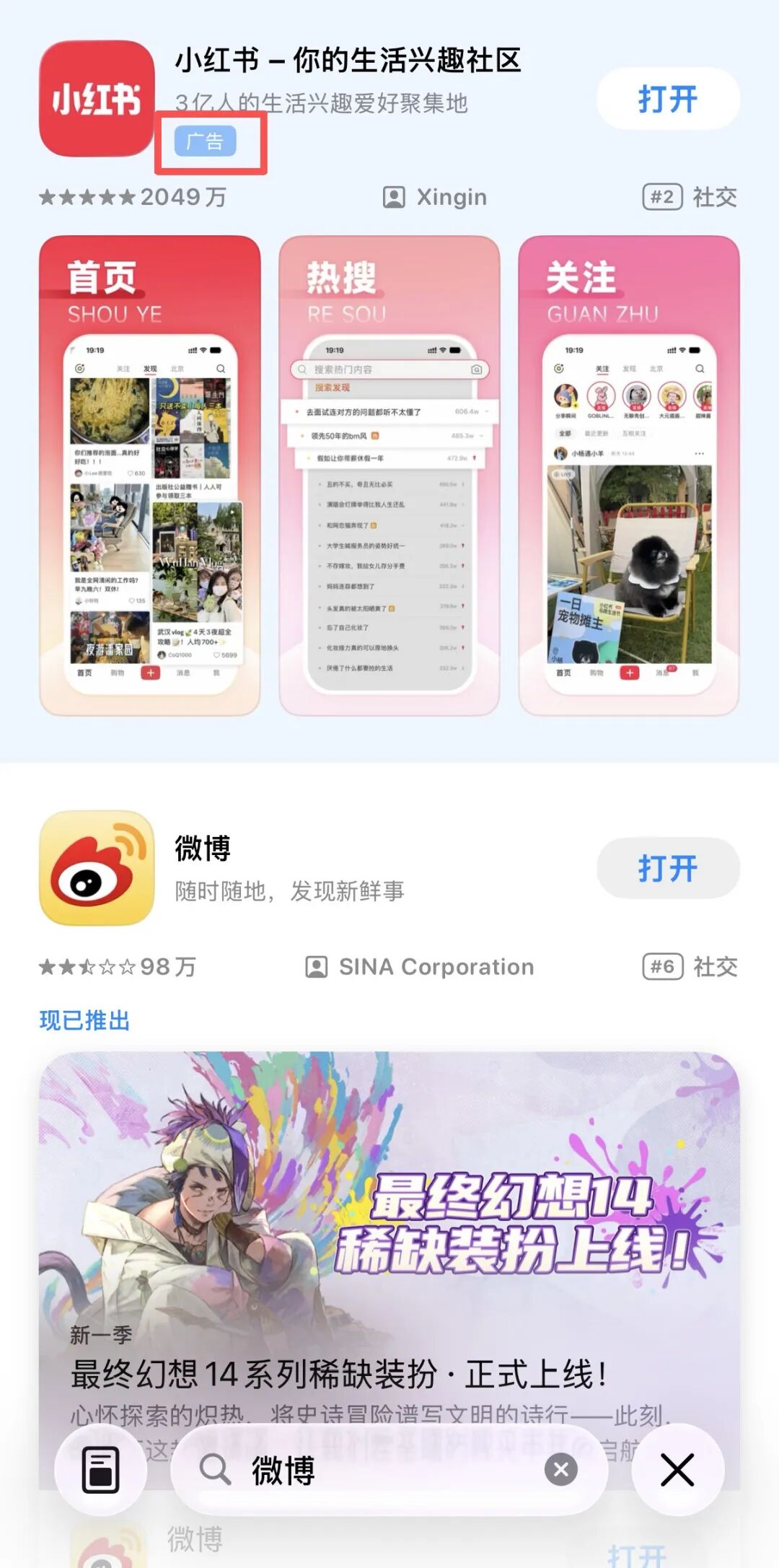 比如搜索“微博”时,顶部的搜索结果中出现了竞品“小红书”的广告。出现这种情况的原因是,后者针对这类特定搜索关键词进行了定向投放,并且在该广告位的竞价中胜出。