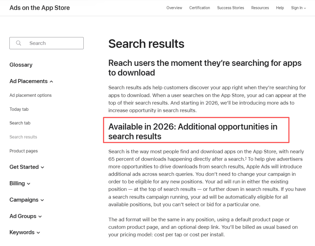 今日,该公司在其Apple Ads(苹果广告)官网的更新公告中宣布,为“增加搜索结果中的广告投放机会”,将于明年起新增更多广告位。而广告将会放在靠后位置。