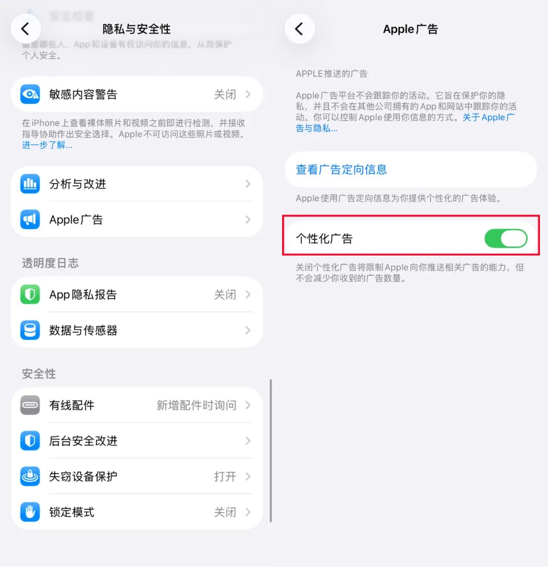路径:打开 「设置」 > 「隐私与安全性」 > 「Apple 广告」,关闭 「个性化广告」 开关。
