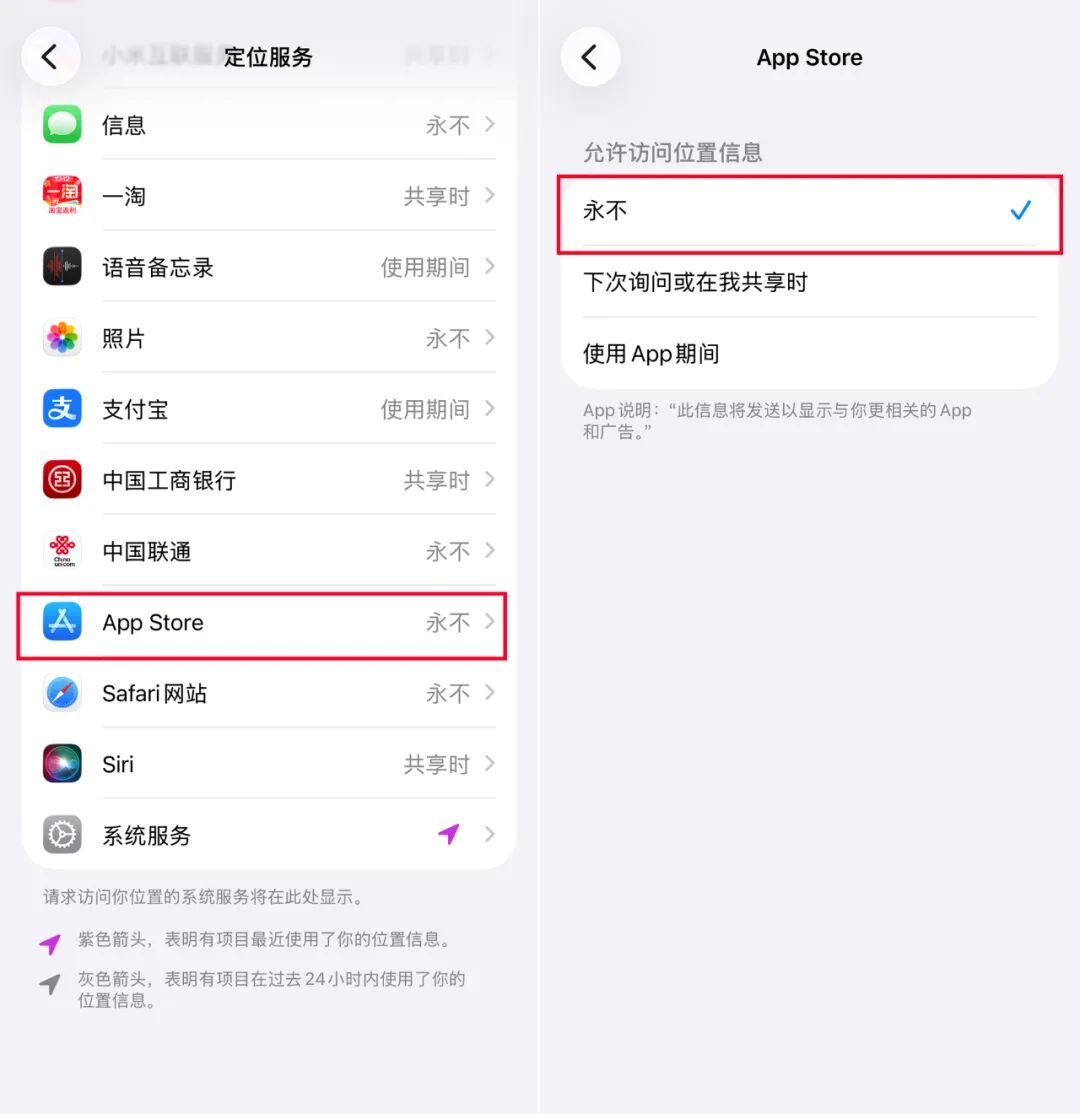 路径:「设置」 > 「隐私与安全性」 > 「定位服务」 > 找到 「App Store」,将允许访问位置信息设置为 「永不」。