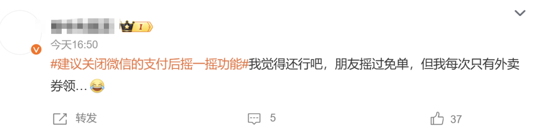 不过,针对这位博主关于微信支付后摇一摇“太灵敏、全是广告、容易误触,甚至可能泄露隐私或诱导老人被骗”的观点,许多网友持反对意见,认为这个功能可以领取银行立减金、话费券、加油券、外卖优惠券等,是实实在在的“羊毛”,为什么要关闭?