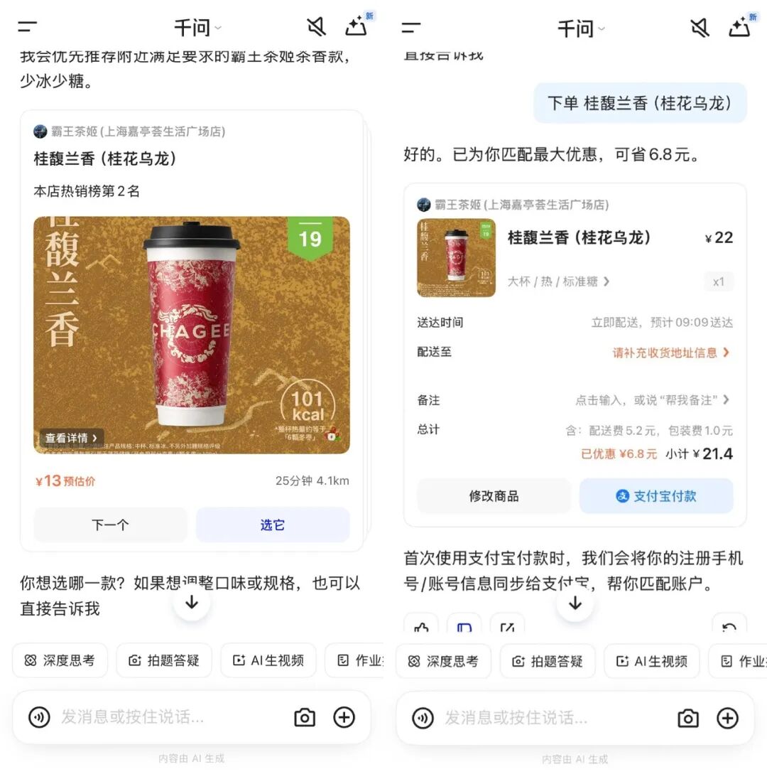 比如,用户只需在千问的聊天框里输入“帮我点杯XX家的XX奶茶”,千问会自动调用淘宝闪购的服务,定位你附近的门店,生成订单,并通过内置的“支付宝AI付”功能直接付款。