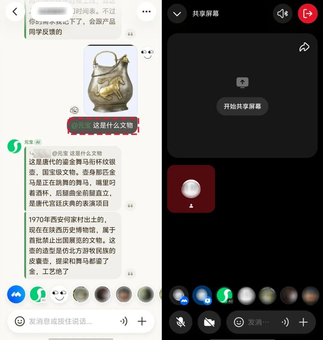 除进行群聊、与元宝AI对话外,还可直接拍摄或发送图片与文件要求它答疑解惑,甚至还支持实时共享屏幕,方便进行远程教学、游戏连麦或者共同完成工作汇报。